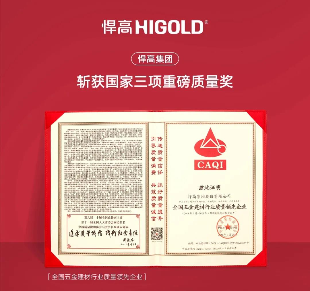 传递质量信任,引导质量消费,悍高集团继2021年年初荣获“全国质量检验稳定合格产品”等荣誉后 午夜视频,近日,悍高集团再度获得“全国五金建材行业质量领先企业”,“全国五金建材行业质量领先品牌”,“全国质量检验稳定合格产品”三项殊荣。
